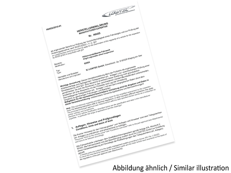 1. Bei Bestellung der Herstellererklärung zusammen mit MegaLow Fahrwerk: Gib bitte vor Bestellabschluss unter "Anmerkungen" die Fahrgestellnummer des Fahrzeuges an. 2. Bei nachträglicher Bestellung der Herstellererklärung: Gib bitte vor Bestellabschluss unter "Anmerkungen" die Fahrgestellnummer des Fahrzeuges und die Nummer des Produkts (über Produktsuche im Shop) an, für das du die Herstellererklärung benötigst.