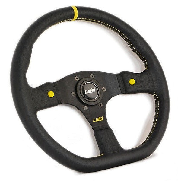 Luisi Stealth Corsa HP Sportlenkrad Leder schwarz mit Nähten & 12 Uhr Markierung in gelb - leicht geschüsselt & mit TÜV Prüfbericht- wahlweise mit Standard Speichen in schwarz oder von uns hochwertig veredelt in Carbon Optik -Mit dem Luisi Stealth bekommst du ein leicht geschüsseltes Sportlenkrad mit einer traumhaften Motorsport Optik.